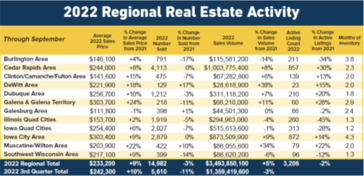 Four of the markets Ruhl&Ruhl Realtors serves participated in the survey and appear below the national average for housing costs. Even with steady home appreciation in the last few years, the Burlington, Cedar Rapids, Iowa City, and Quad Cities markets remain well below the average home price of $465,991. As shown in the chart below, the 2022 3rd Quarter Average Sales Price for our region is $242,300.