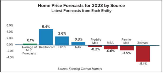 "After years of high-flying tech cities dominating real estate who's-who lists, this year's top performers are expected to be modest, mid-sized domestic, industry hubs in the Northeast, South, and Midwest. The slow and steady real estate markets in these areas continue to be affordable and will be the stars in 2023, better weathering the affordability challenges that loom ahead." - Danielle Hale, Chief Economist, Realtor.com. Experts forecast that nationally home prices will go anywhere from 5% depreciation to 5% appreciation in 2023. See the forecast chart by source and regional appreciation below. The average of seven forecasts is 0.1% appreciation. Markets seeing the most significant drops will be those where home values grew the most rapidly, so even with prices dropping, home values will probably still be up year over year.